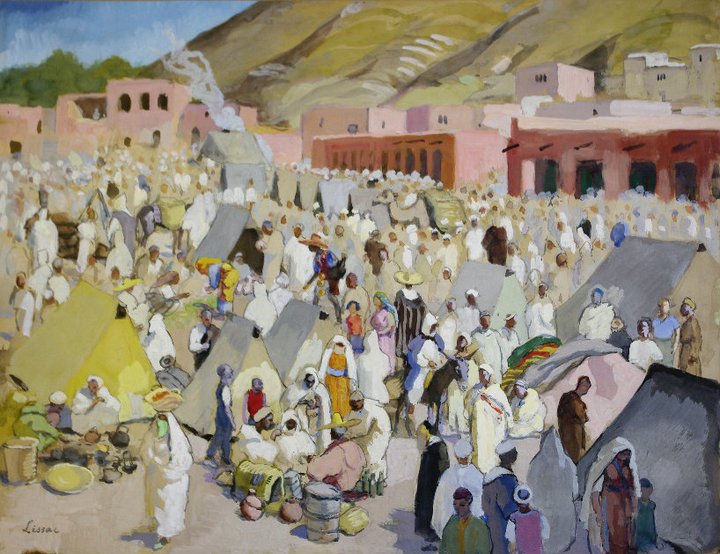 Figure 3 : Le souq d’Imintanout en 1952. Gouache de Pierre Lissac (mon grand-père maternel). Vue prise en direction du mont Ourgouz, dont on voit les premiers contreforts. Derrière les tentes du premier plan, on reconnaît de gauche à droite Jacques Berque (cravate de travers), ma sœur Valérie alors âgée de 8 ans (chemisette orange) avec notre nounou Dada (vêtement mauve) et tout à droite, avec un mokhazni, M. Châtelain, qui dirigeait l’agence locale des Eaux-et-Forêts, et qui a, entre autres, reboisé l’Ourgouz.